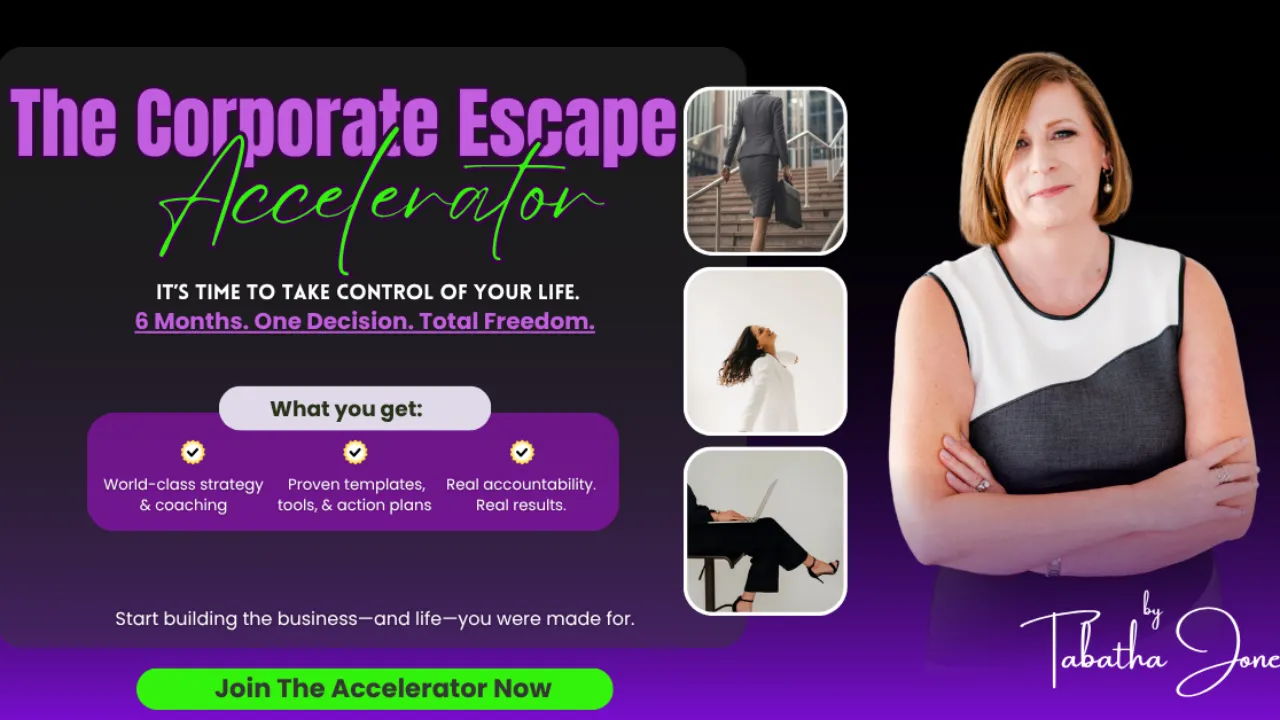 The Corporate Escape Accelerator is a 6-month, done-with-you program designed to help you build a clear, profitable business while you’re still employed — with hands-on coaching, accountability, and real momentum.